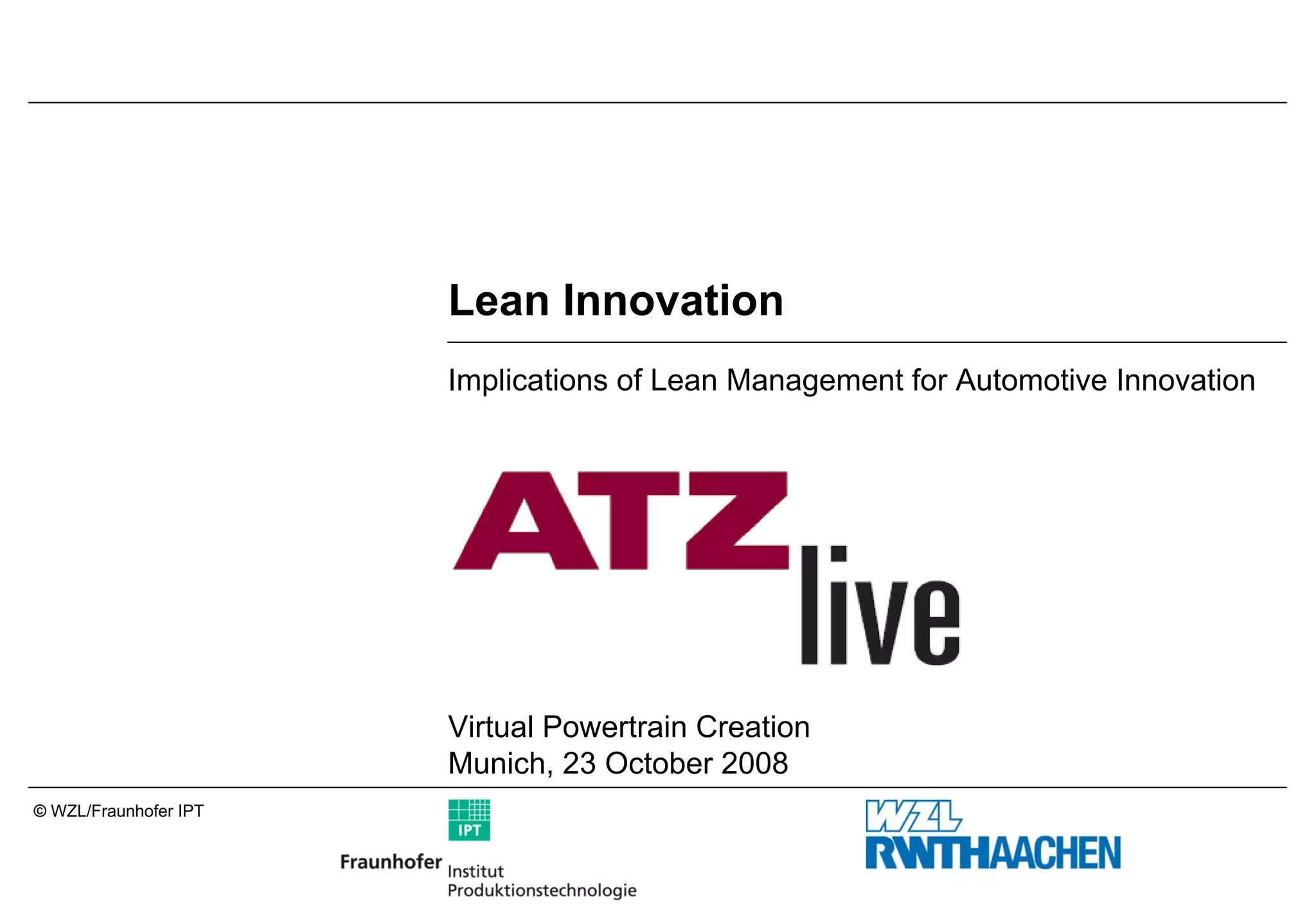 The document discusses the principles of lean innovation and its implications for automotive innovation, with a focus on optimizing research and development spending to achieve higher sales growth. Key challenges in innovation management include vague objectives and unclear specifications, which can significantly hinder efficiency. The importance of transparent value systems and effective design space management in overcoming these challenges and enhancing product development success is emphasized.