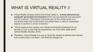 Virtual reality is a computer-generated 3D environment that can be interacted with by the user. It aims to fully immerse the user by engaging multiple senses. The document discusses both benefits and drawbacks of VR, including its potential to treat mental health issues, foster relationships, provide escapism, and influence various industries like marketing, journalism, and social media. However, it may also cause issues like developing false realities and addictions. The document also outlines both expensive and inexpensive ways for users to experience VR.