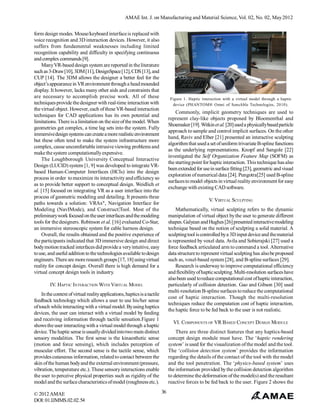 This document explores the integration of virtual reality (VR) technologies into the concept design phase of product development, highlighting its potential to enhance creativity and efficiency in industrial design. It identifies significant bottlenecks in current VR applications, including limitations in real-time rendering, collision detection, and the simulation of physical properties for virtual models. The paper emphasizes the need for innovative VR-based tools that facilitate interactive design, allowing designers to intuitively modify and validate product concepts through immersive experiences.