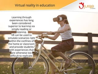 Virtual reality has the potential to enhance education by simulating real-world experiences that may otherwise be difficult or impossible to replicate in a classroom. VR can make learning more engaging and accessible for students with disabilities. It allows complex concepts to be explained through interactive simulations of scientific experiments that cannot be conducted in real life. However, widespread adoption of VR in education faces challenges such as developing localized content for different regions and audiences, targeting popular platforms, and creating effective learning experiences that leverage VR's advantages.