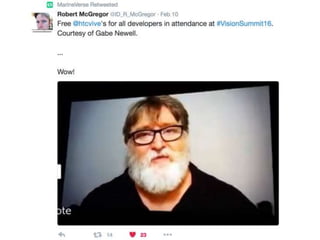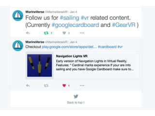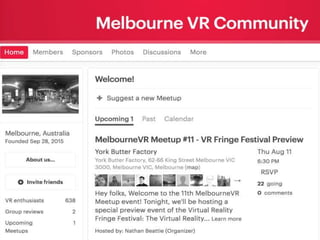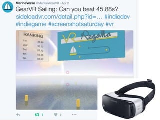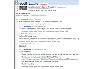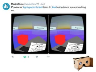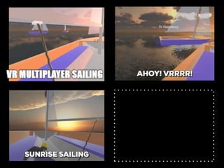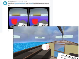 The document discusses building and growing a community around virtual reality (VR) and sailing through a platform called Marineverse. It emphasizes a process of delivering value by identifying problems and opportunities, prototyping, and learning through iteration. Resources and tools for VR development are also provided, alongside links to tutorials and meetups.