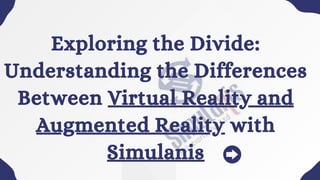 This document explores the differences between virtual reality (VR) and augmented reality (AR), highlighting their unique features, applications, and the technology behind them. Simulanis utilizes both VR and AR to enhance training and education, making experiences more engaging and effective. It also discusses the promising future of these technologies and their potential to transform various industries.