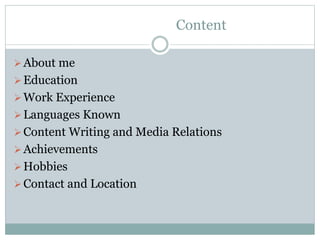 Mohammed Faiza Ahmed is a student pursuing a PG Diploma in Corporate Communication and Public Relations. He has a BA in Spanish language and diplomas in Arabic language. His work experience includes content writing and media relations for DuPont and Leaders Lamp Foundation. He is proficient in English, Spanish, Urdu, and Arabic. His hobbies include adventure, travelling, theatre, and trekking. He can be contacted at the phone number and email address provided or through his LinkedIn profile.