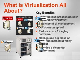 Virtual Server 2005 provides virtualization capabilities that allow consolidating servers to reduce costs. It offers key benefits like increased hardware utilization, single point of management, and test environments. Customers are seeing savings of millions of dollars by deploying hundreds to thousands of virtual machines. The architecture isolates guest operating systems and applications from physical hardware through virtual devices and resource management. This enables easy migration of workloads between physical and virtual servers with minimal downtime.