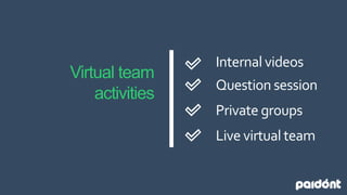 The document discusses the importance of virtual team building activities for enhancing engagement among remote workers. It outlines strategies such as creating spaces for personal video sharing, conducting email question sessions, and establishing private groups for better communication. Additionally, it emphasizes the effectiveness of live virtual interactions to foster a collaborative work culture.