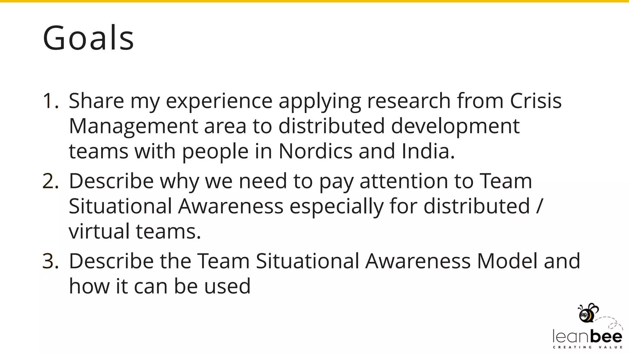 The document discusses the application of crisis management research to improve team situational awareness in virtual teams, particularly among distributed development teams in the Nordics and India. It emphasizes the importance of shared situational awareness, effective information sharing, and common goals for enhancing team performance. Additionally, the document highlights the team situational awareness model and methodologies like empathy walks that can foster mindset changes and improve collaboration.