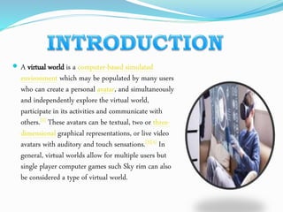 This document provides an overview of virtual worlds, including definitions and descriptions. It discusses how virtual worlds allow multiple users to interact through avatars and explore simulated environments. The document also summarizes key aspects of virtual worlds such as economies, geography, research applications, social interactions, medical uses, commercial uses, education, and depictions in fiction.