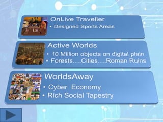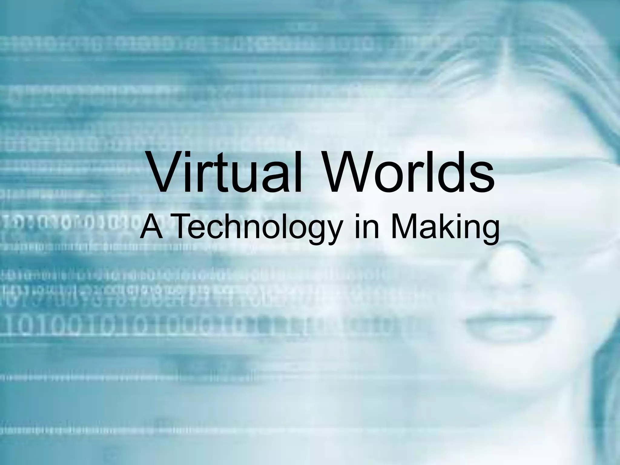 Virtual worlds are computer-based simulated environments where users interact through avatars. They allow users to communicate, use objects, and create things. Common examples include social networking sites, 3D movies, and training simulators. While virtual worlds provide opportunities for communication and individual expression, they also pose social risks like isolation and desensitization. However, their use is growing and expanding to more fields, indicating virtual worlds are an emerging technology that will continue revolutionizing science and technology.