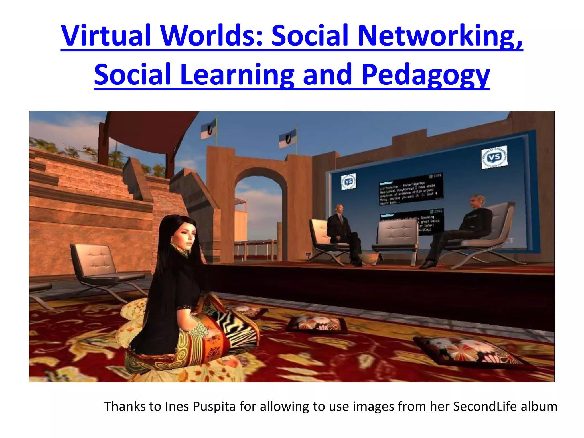 The document discusses the concept of virtual worlds, detailing their evolution, types, and significance in education, particularly focusing on online learning and immersive experiences. It highlights case studies from various institutions, showcasing successful applications of virtual environments in teaching and learning. Additionally, it examines the pedagogical approaches suited for virtual worlds and identifies both effective and ineffective practices in their educational use.