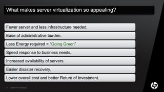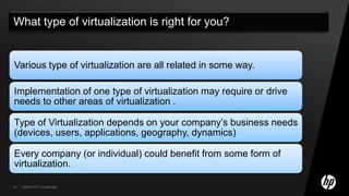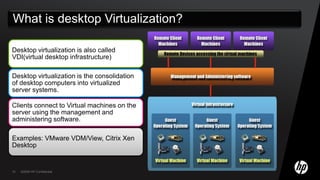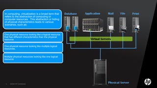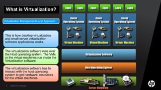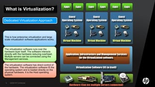 The document provides an introduction to virtualization technology, defining it as the creation of virtual versions of various resources like operating systems and servers. It discusses two approaches to virtualization: internal and external network virtualization, with examples including VMware and Microsoft Hyper-V. The benefits of virtualization are highlighted, such as server consolidation, improved hardware efficiency, and faster deployment among other advantages.