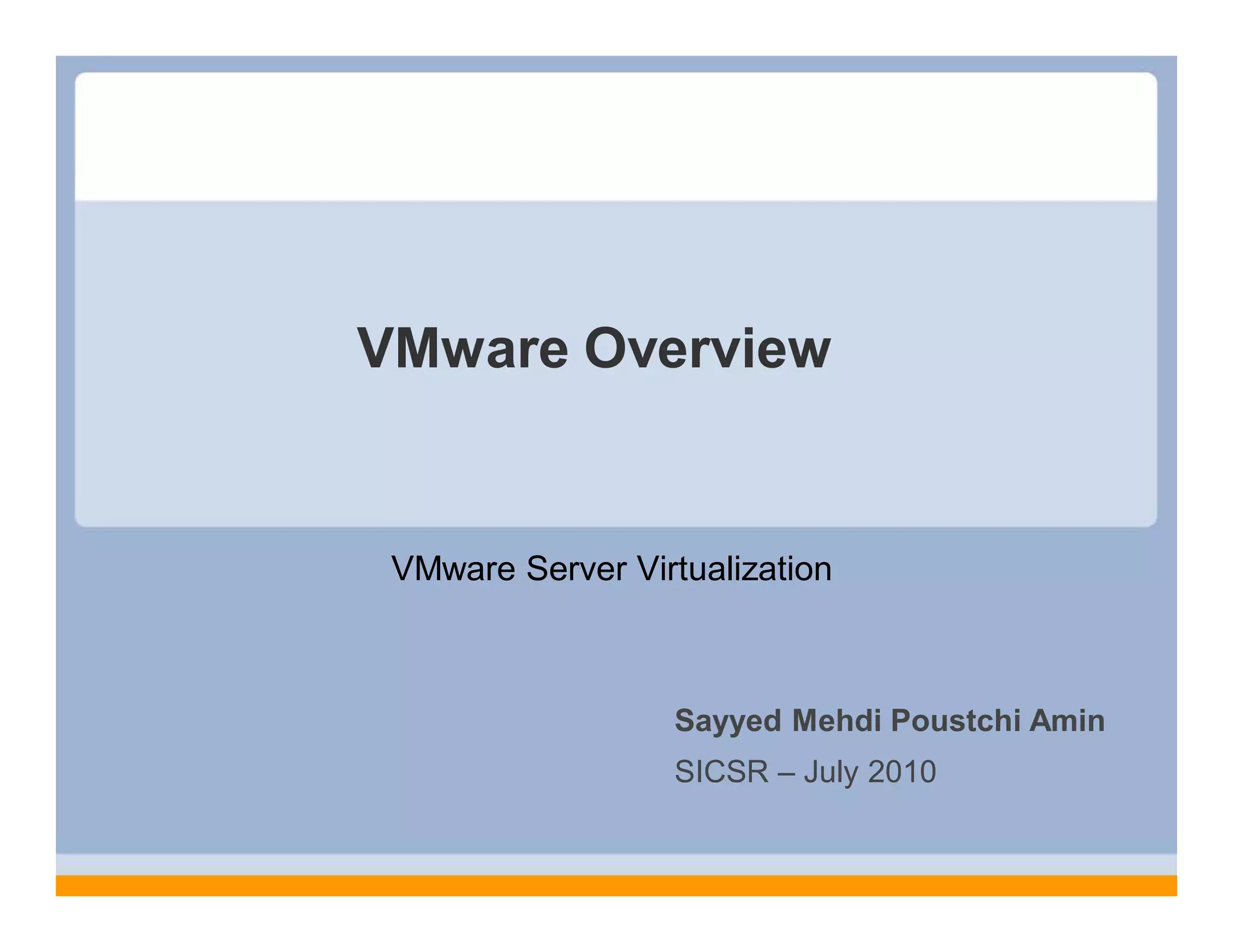 VMware provides server virtualization software that allows multiple virtual machines to run on the same physical server. This increases hardware utilization and consolidation ratios. Key benefits include reduced costs from lower hardware, power, cooling, and real estate needs as well as faster provisioning times. VMware's product line includes ESX Server, VirtualCenter, VMotion, DRS, HA, and other tools for managing and optimizing virtualized environments. Customers report benefits like supporting more workloads without increasing staff and reducing provisioning time from weeks to hours.