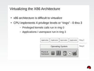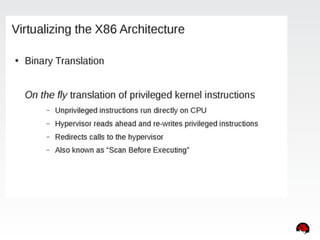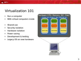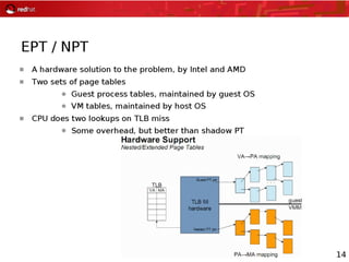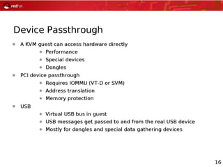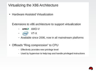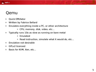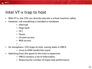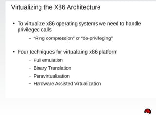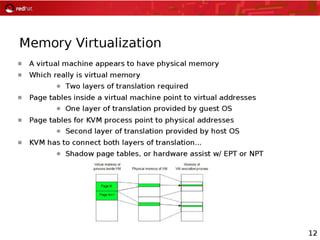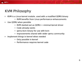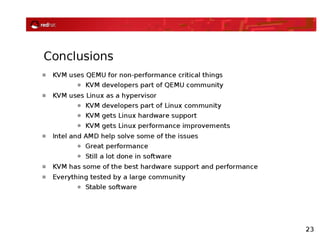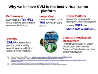 This document discusses KVM virtualization and why it is considered the best platform. It states that KVM provides high performance, strong security through EAL4+ certification and SE Linux, and can save customers up to 70% on costs compared to other solutions. It also supports various operating systems and works with Red Hat products like OpenStack and Red Hat Enterprise Virtualization for managing virtualization. Charts are included showing KVM outperforming VMware on benchmark tests using different CPU core counts.