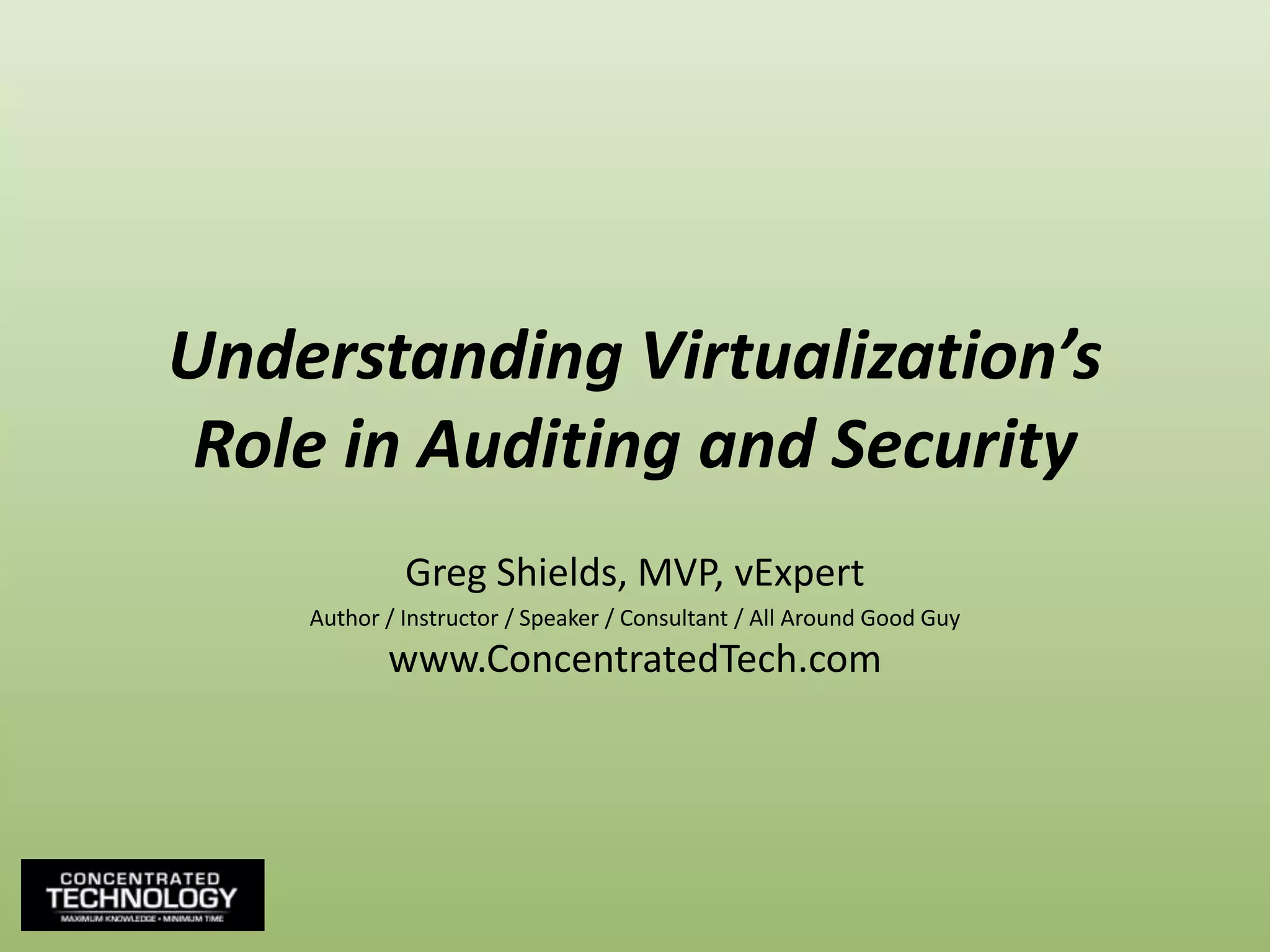 This document summarizes a presentation on understanding virtualization's role in auditing and security. It begins with introducing the speaker, Greg Shields, and his background and expertise in virtualization. It then discusses some key points about virtualization including what it is, what it does by virtualizing computer resources like memory, processors, network cards and disks, and some of the problems it can help solve like disaster recovery and server consolidation. It also discusses the seven elements of a successful virtualization architecture including recognizing hype, doing an assessment of your environment, purchase and implementation, physical to virtual conversions, high availability, backups, virtualizing desktops, and disaster recovery implementation.