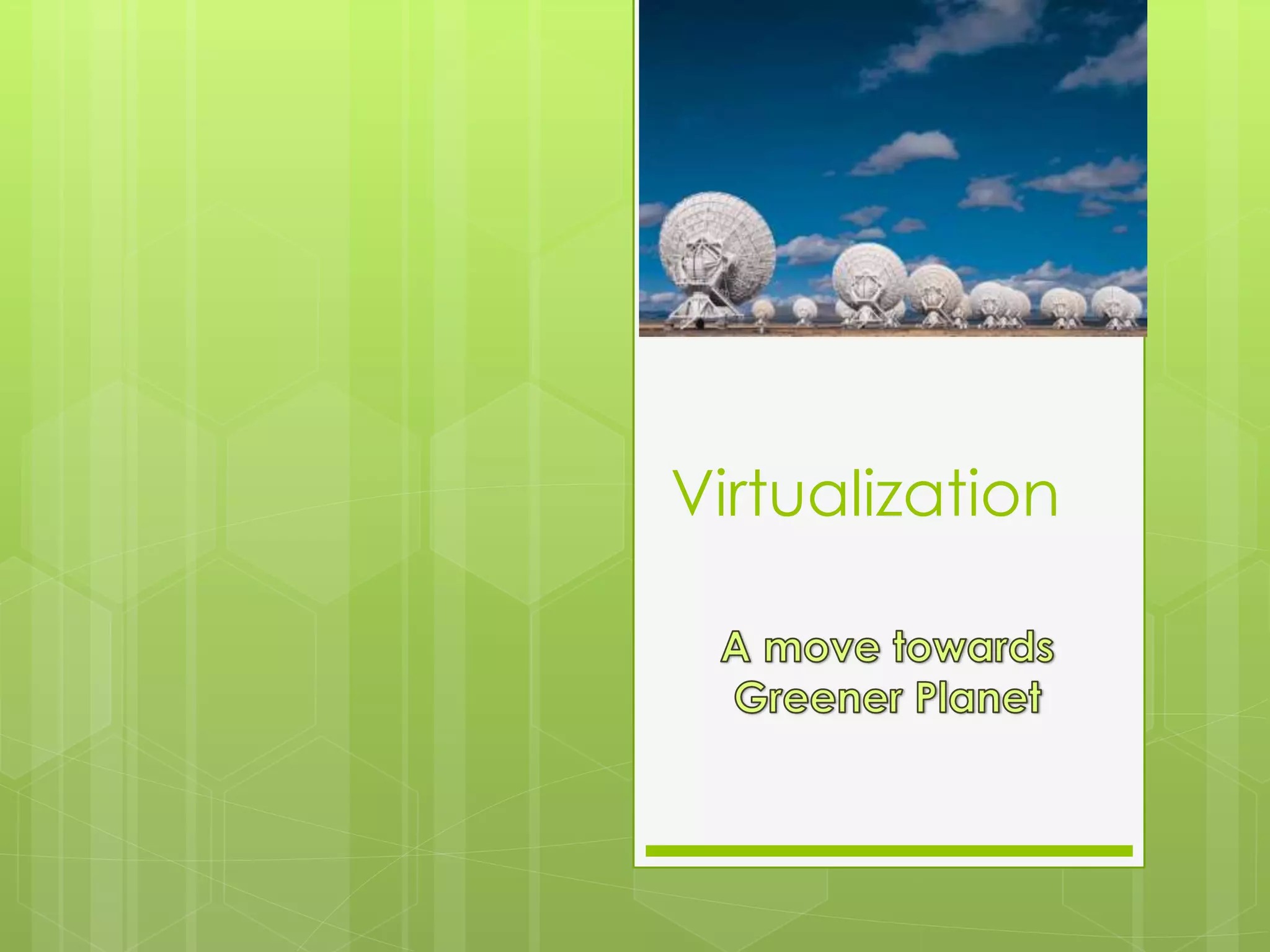 Virtualization allows a single physical machine to run multiple virtual machines, making hardware resources available to multiple virtual operating systems. This is done through a hypervisor or virtual machine monitor that allocates physical resources to virtual machines. Virtualization provides benefits like reduced costs, increased hardware utilization, and isolation of environments while sharing resources. The main types of virtualization are execution level (using a hypervisor), operating system level (through time-sharing), programming level (through virtual machines like Java), application level, storage, and network.