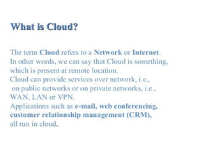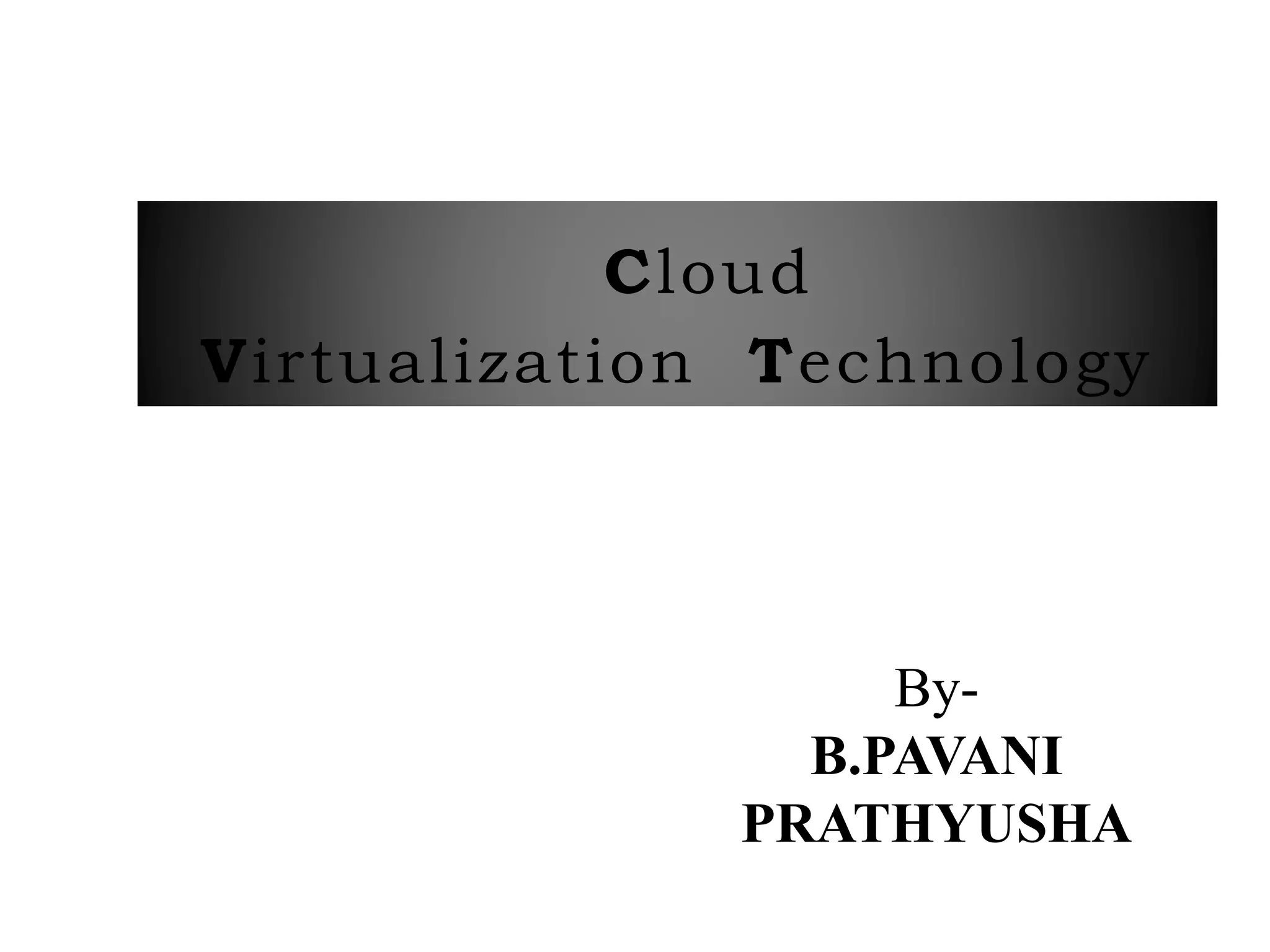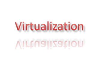 This document discusses various types of virtualization including cloud virtualization. It defines virtualization as transforming hardware into software which allows multiple operating systems to run as virtual machines. It describes full virtualization using a hypervisor, para-virtualization where guest servers are aware of each other, and server virtualization which allows VMs to run on different physical servers. The document outlines benefits of cloud virtualization including cost savings, increased control, and simplified disaster recovery.