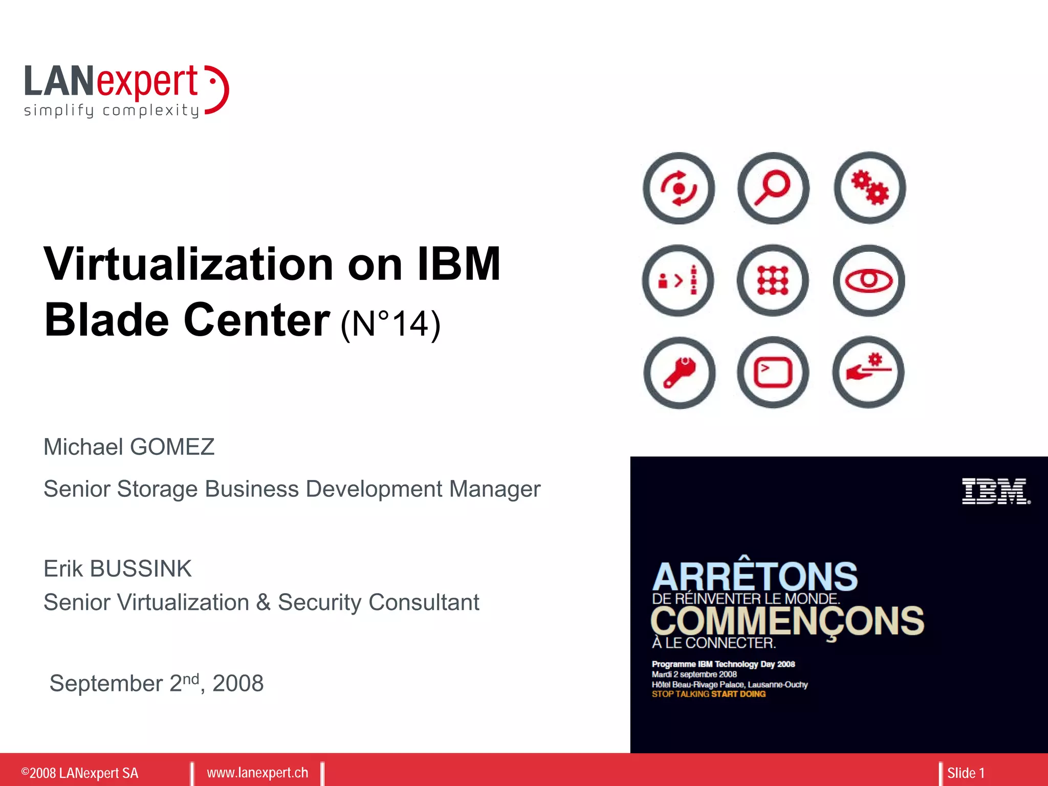 The document discusses virtualization on IBM BladeCenter, outlining the differences between consolidation and virtualization, as well as the evolution of CPU technology for virtualization management. It emphasizes the benefits of using IBM BladeCenter for server consolidation, including cost reduction and increased efficiency, and explores various virtualization technologies and their applications. Key components include VMware vSphere features, high availability, and disaster recovery management strategies.