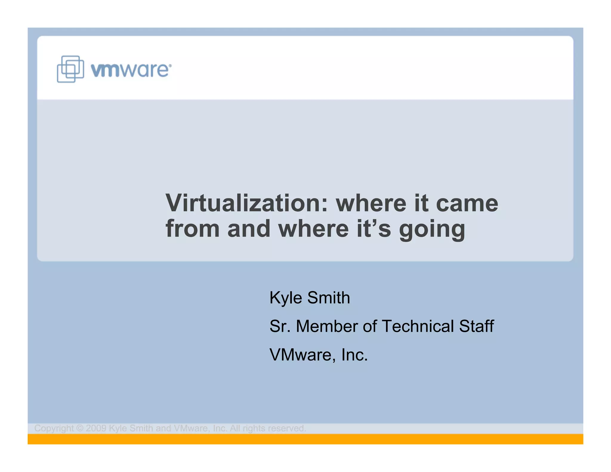 The document discusses the evolution of virtualization, beginning from its origins in mainframe time-sharing to its current state and future possibilities. It highlights key developments, competition, and the transition from traditional architectures to dynamic infrastructure, emphasizing VMware's pivotal role in driving innovation. Future trends include mobile virtualization, virtual desktops, and cloud computing, with an emphasis on centralized management and security.