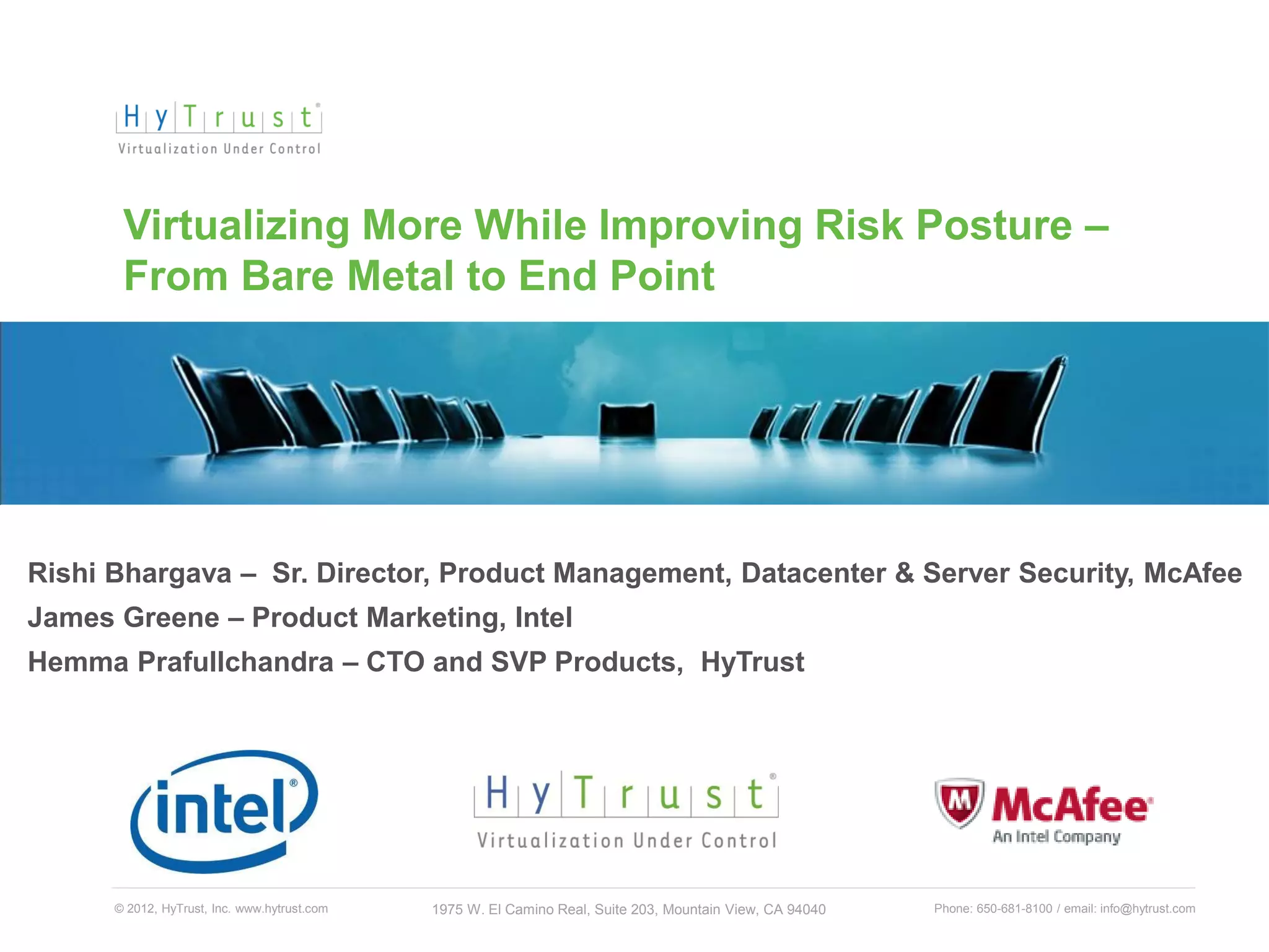 Virtualizing more of an organization's workloads presents both opportunities and risks. As more mission-critical workloads are virtualized, security and compliance become greater priorities. Purpose-built solutions that provide security, visibility, and control over virtual infrastructure and assets are needed. Intel, HyTrust, and McAfee are partnering to provide comprehensive solutions through technologies like Intel TXT, the HyTrust Appliance, and McAfee security products to help organizations securely virtualize more workloads while improving their security posture and compliance.