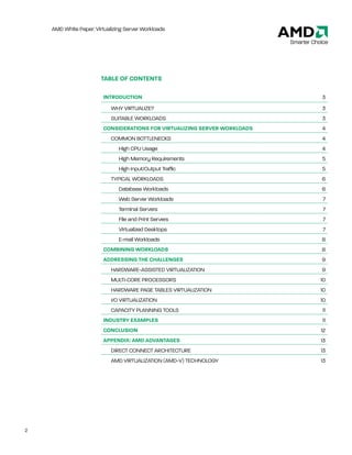 The AMD white paper discusses advancements in hardware virtualization technology enabling a broader range of x86 server workloads to be virtualized, moving beyond traditional test environments to mission-critical applications. It emphasizes that understanding the distinct performance characteristics of various workloads is vital for effective virtualization strategies, while also highlighting common bottlenecks such as high CPU, memory, and I/O traffic. The document further outlines improvements in virtualization technology and hardware that facilitate the virtualization of workloads previously deemed unsuitable.