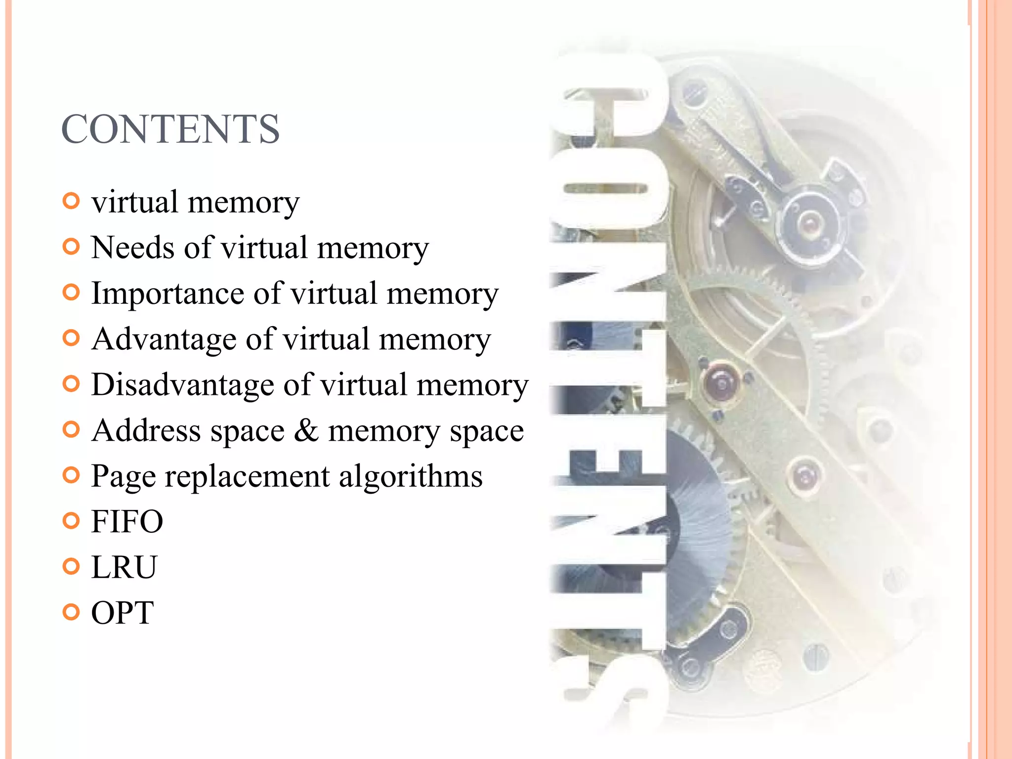 Virtual memory allows a computer to use more memory (called the address space) than is physically installed in the system (the memory space) by storing rarely used data on disk. When data is needed, it is moved back into memory. This allows for multiprogramming and for individual programs to be larger than physical memory. Common page replacement algorithms that determine what data to remove from memory and store on disk include first-in, first-out (FIFO), least recently used (LRU), and optimal (OPT) which removes the page not used for the longest time.