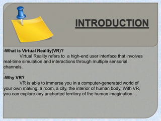 Virtual reality uses computer technology to create realistic 3D environments that users can interact with through headsets, gloves, and other equipment. It has applications in entertainment, education, and training by simulating real-world experiences. While VR offers benefits like hands-on learning without risks, it still faces challenges like high costs, technical limitations, and potential overuse replacing real-world interactions. As the technology continues advancing, VR is poised to transform many industries and activities.