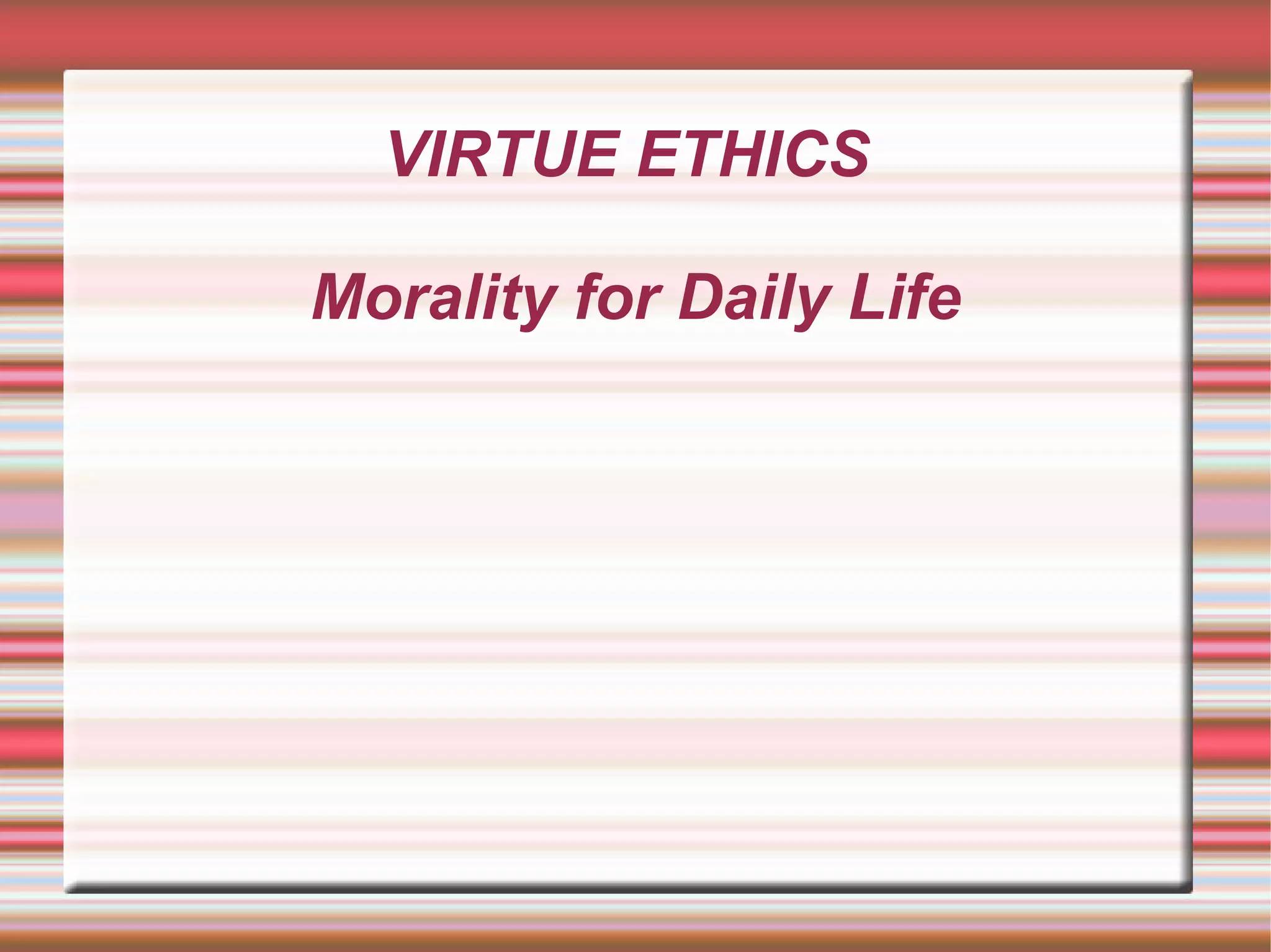 Virtue ethics focuses on developing good moral character through practicing virtues, or good habits. There are two types of virtues - divine virtues like faith, hope and love that are gifts from God, and cardinal virtues like prudence, justice, fortitude and temperance that are acquired through practice. Developing virtues involves making good choices in daily life to become more perfected in imitating Christ.
