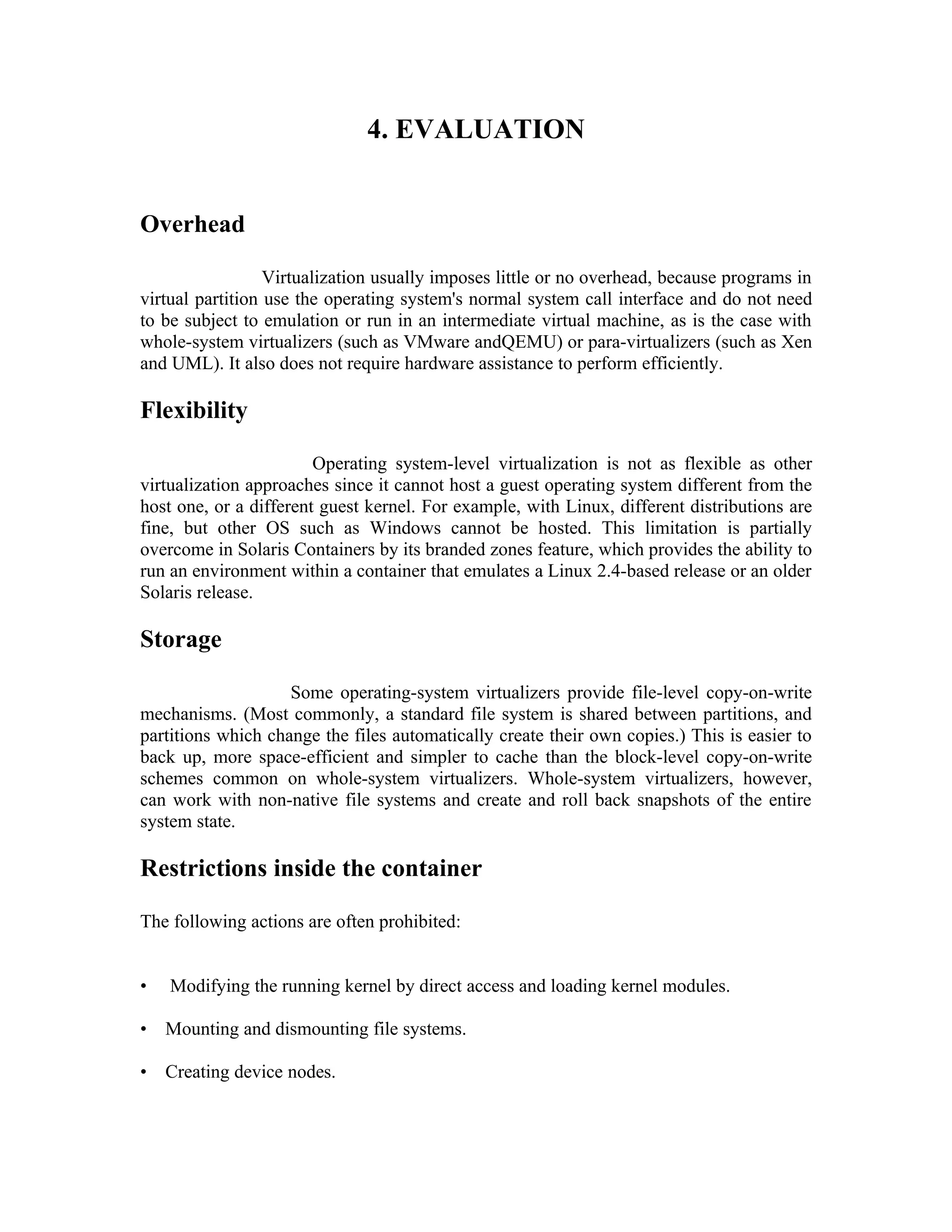 Operating system-level virtualization imposes little overhead as guest programs use the host OS interface without emulation. However, it is not as flexible as other approaches as it can only host the same OS as the host and not different OSes. Some OS virtualizers provide file-level copy-on-write to back up data more efficiently than block-level schemes used by whole system virtualizers. Restrictions are placed on containers to prevent modifying the kernel or accessing certain resources. Virtualization has matured and is used for server consolidation, operational agility through live migration, high availability, and improving responsiveness of IT operations.