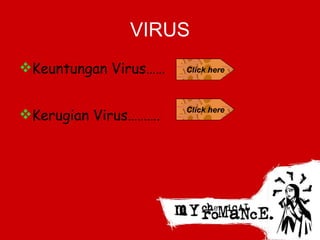 Dokumen ini membahas tentang keuntungan dan kerugian virus, termasuk pemanfaatan virus dalam bidang kesehatan dan genetika. Virus memiliki kegunaan dalam penelitian medis dan pengembangan vaksin, namun juga menimbulkan risiko melalui penyakit seperti HIV, flu burung, dan demam berdarah. Informasi detail mengenai berbagai virus dijelaskan, termasuk cara penularan dan gejalanya.