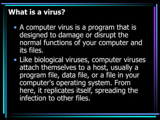 Computer viruses are programs that damage or disrupt normal computer functions. They attach themselves to files and replicate, spreading infection. Viruses can be transmitted via email, downloads, disks, and networks. Different types of malware include viruses, worms, Trojan horses, and hoaxes. To protect against viruses, users should install antivirus software, regularly update definitions and scan for viruses, avoid opening suspicious email attachments, and use firewalls.