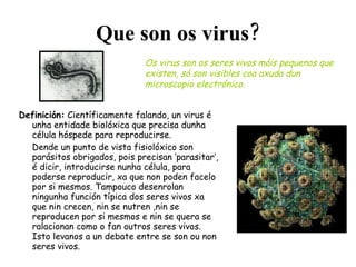 Que son osvirus? Definición: Científicamente falando, un virus é unha entidade biolóxica que precisa dunha célula hóspede para reproducirse. Dende un punto de vista fisiolóxico son parásitos obrigados, pois precisan ‘parasitar’, é dicir, introducirse nunha célula, para poderse reproducir, xa que non poden facelo por si mesmos. Tampouco desenrolan ningunha función típica dos seres vivos xa que nin crecen, nin se nutren ,nin se reproducen por si mesmos e nin se quera se ralacionan como o fan outros seres vivos. Isto levanos a un debate entre se son ou non seres vivos. Os virus son os seres vivos máis pequenos que existen, só son visibles coa axuda dun microscopio electrónico.
