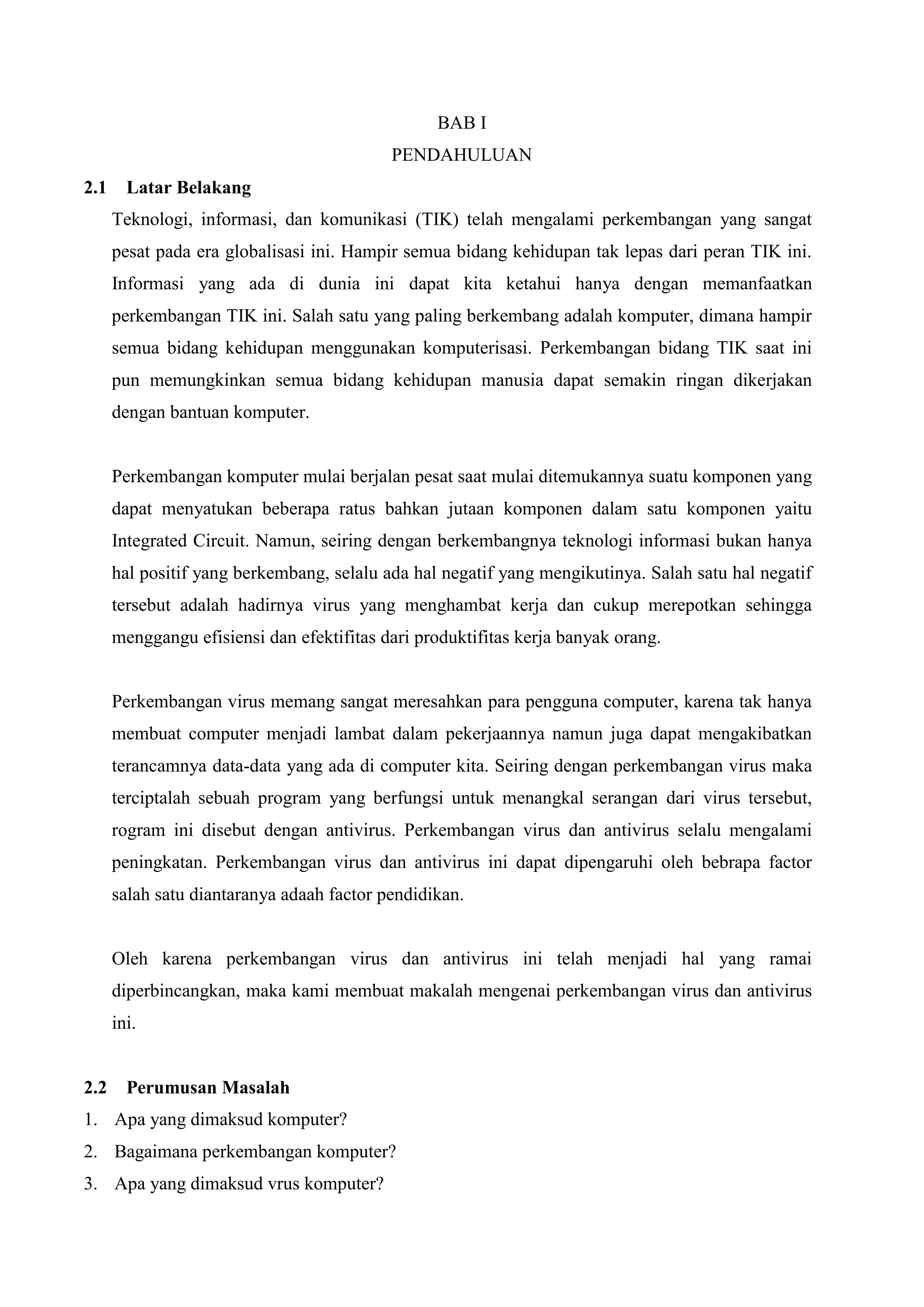 Dokumen ini membahas perkembangan teknologi informasi dan komunikasi serta peranannya dalam kehidupan sehari-hari, dengan fokus pada virus komputer dan perangkat lunak antivirus. Virus komputer dapat merusak data dan mengganggu produktivitas, sementara antivirus berfungsi untuk mendeteksi dan menghapus virus. Pendidikan memiliki pengaruh besar dalam perkembangan virus dan antivirus, baik dalam menciptakan solusi yang bermanfaat maupun dalam penyalahgunaan teknologi.