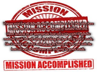 Viruses can infect all forms of life and are found anywhere there are cells, including in soil, water, and air. Viruses lie dormant until entering a host cell, usually through the nose, mouth or breaks in the skin. Once inside a host cell, the virus attaches and releases its genetic material, hijacking the cell's enzymes to produce new virus particles which then break free and infect other cells. Viruses are considered by some scientists to be both living and non-living, as they are inactive particles outside of a host cell but become active reproducers inside a living cell.