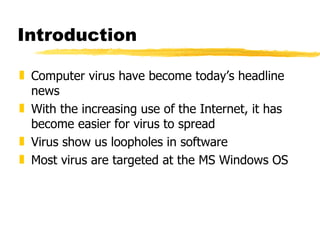 The document provides an overview of computer viruses including their definition, symptoms, how they work and spread, different types of viruses like worms and trojans, examples of specific viruses like Melissa and Bubbleboy, and recommendations for protection like using antivirus software and proper configurations. Computer viruses have become common with over 300 new viruses created each month that can slow down or crash systems and spread through email attachments or downloading infected files. Knowledge of how viruses infect systems can help prevent future attacks.