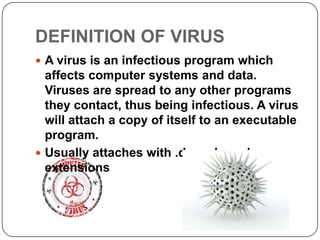 A virus is an infectious program that spreads to other programs and attaches copies of itself, usually with document or executable file extensions. There are several types of viruses including worms, Trojan horses, and logic bombs. A Trojan horse appears harmless but contains malicious code. Types of Trojan horses include remote access and denial of service attacks. A salami attack involves many small, difficult to detect security breaches that combine for a large attack. To combat viruses, users should keep their operating system and antivirus software up to date, use a firewall, and be vigilant about new threats.