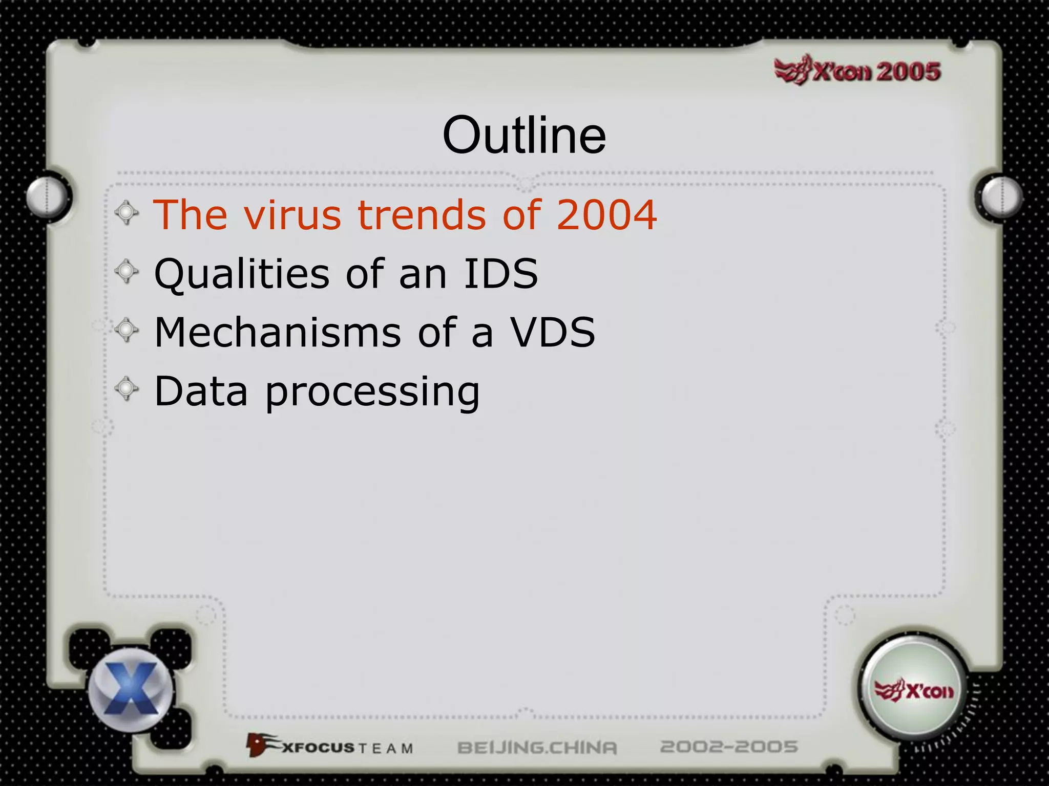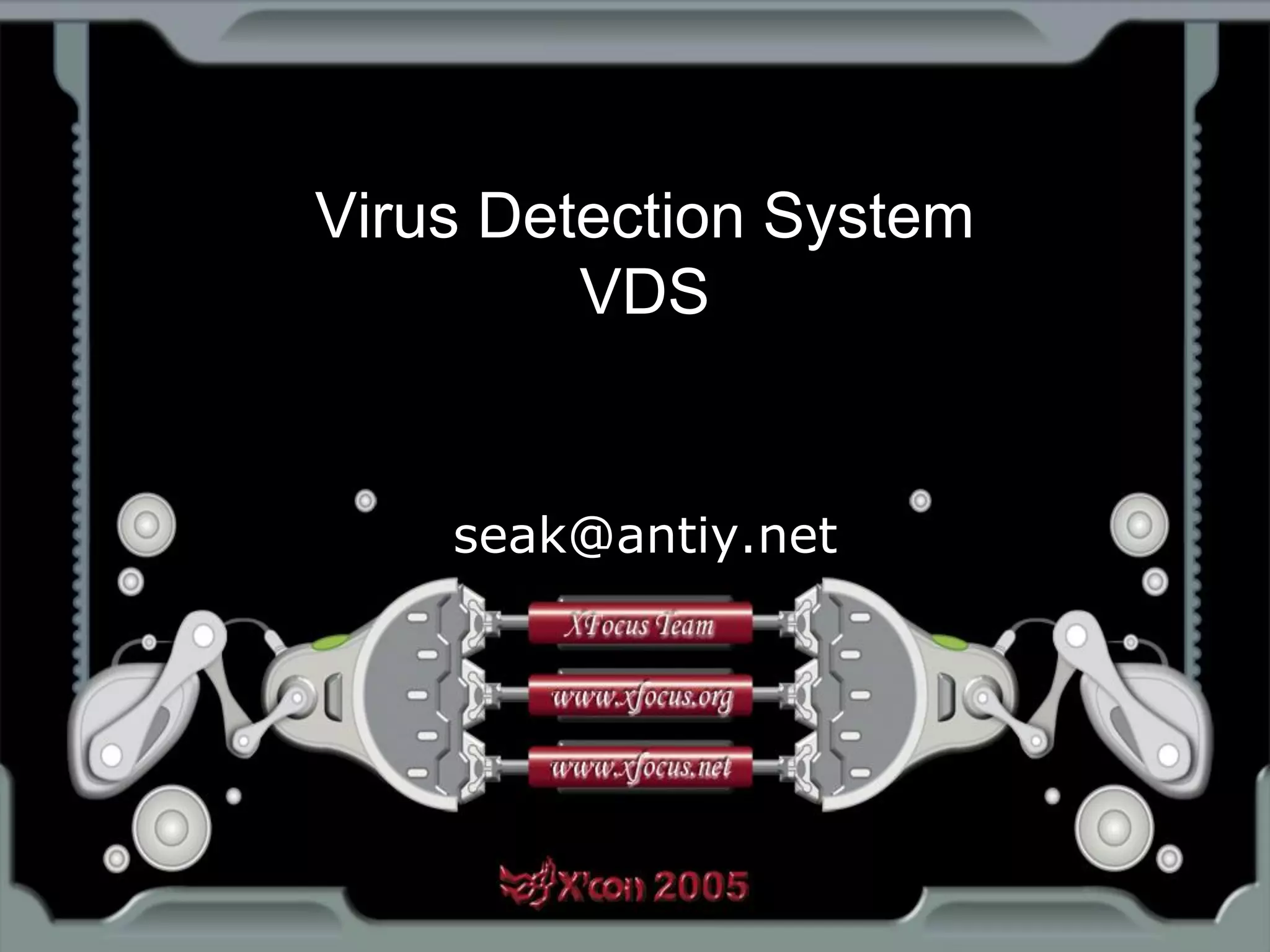 This document discusses a virus detection system (VDS). It summarizes the main virus trends in 2004, with over 50% being Trojans and backdoors. It outlines the qualities needed for an intrusion detection system (IDS), including meticulous protocol analysis and a lightweight rule set. The document describes the mechanisms of a VDS, including using a unified data structure and dataset to classify events. It addresses challenges of scaling the rule set and optimizing detection algorithms as the number of rules increases.