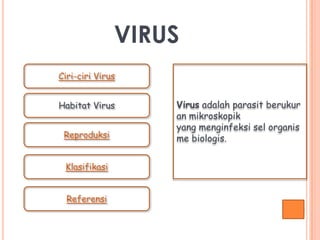 Dokumen ini menjelaskan tentang virus, termasuk ciri-ciri, habitat, reproduksi, dan klasifikasinya. Virus adalah parasit aseluler berukuran mikroskopik yang hanya dapat berkembang biak di sel hidup lainnya dan memiliki berbagai macam bentuk serta struktur. Reproduksi virus dapat dilakukan secara litik maupun lisogenik, dengan klasifikasi berdasarkan kandungan asam nukleat dan cara penyebarannya.