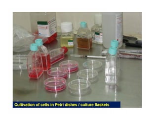 This document discusses the requirements and procedures for virus isolation through cell culture. The four main requirements are a cell culture facility, sterile technique, quality reagents, and knowledge of cell culture techniques. Primary and continuous cell lines differ in their lifespan and ability to produce growth factors. Cell cultures provide a convenient way to isolate viruses compared to eggs or animals. Successful virus isolation relies on appropriate sample collection, processing, and detection of cytopathic effects in cell monolayers through microscopic examination. Quality control measures like reagent screening and aseptic technique help prevent microbial contamination of cell cultures.
