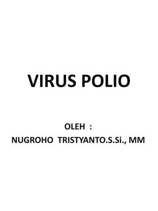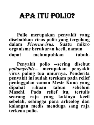 Polio adalah penyakit virus yang disebabkan oleh poliovirus, yang dapat menyebabkan kelumpuhan pada penderitanya, terutama bayi dan anak-anak. Penyebaran virus ini terjadi melalui kontak dengan manusia, dan meskipun Indonesia telah bebas polio sejak 1995, masih ada kemungkinan virus masuk kembali dari negara endemik. Upaya pemberantasan polio meliputi imunisasi rutin, pekan imunisasi nasional, pemantauan kasus, dan imunisasi rumah ke rumah.