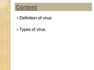 This document defines and describes different types of computer viruses. It begins by defining a computer virus as a program that installs itself on a computer without permission and runs against the user's wishes. It then lists and describes 7 main types of viruses: