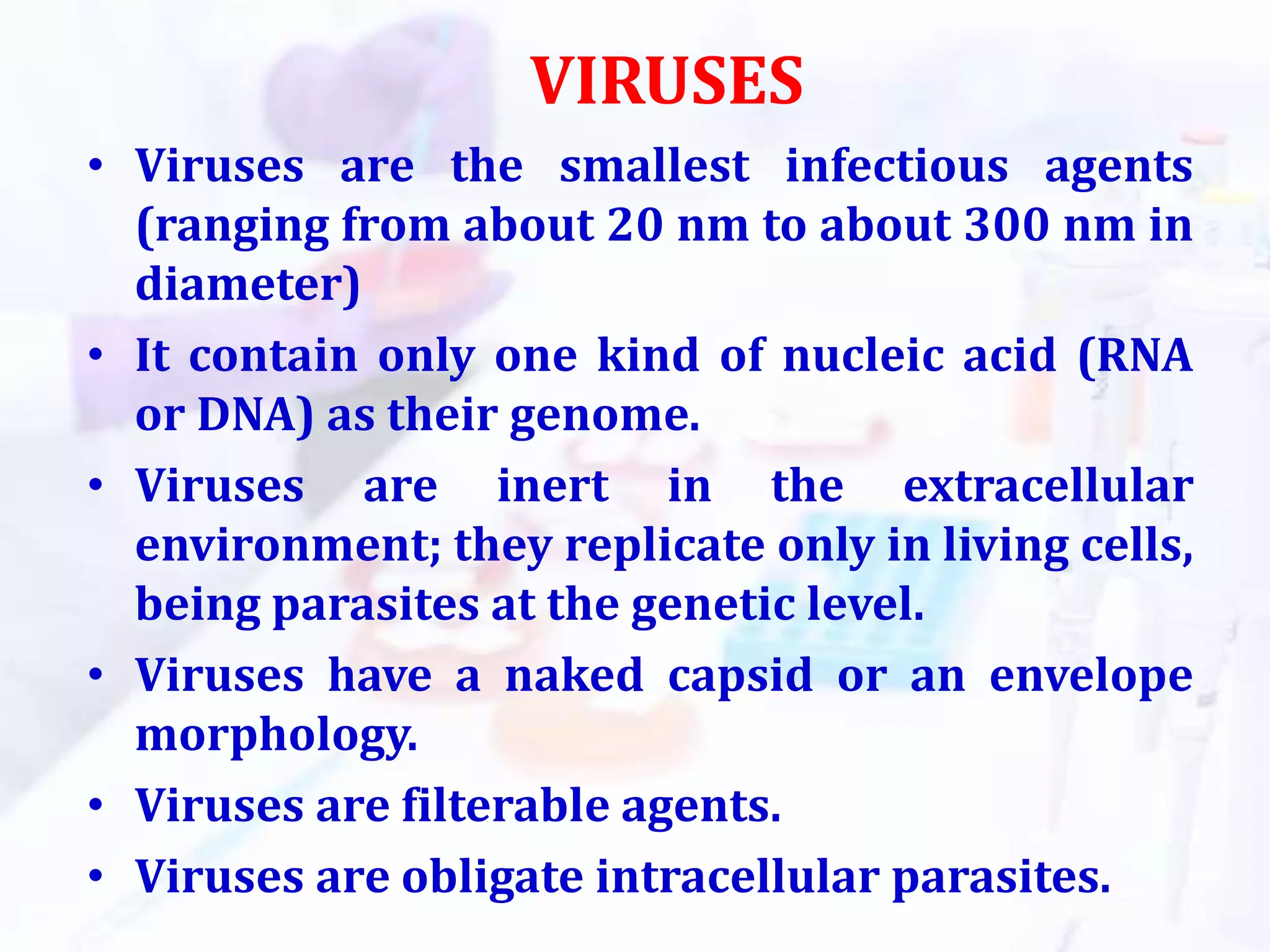 This document discusses virus structure and classification. It defines viruses as the smallest infectious agents containing either RNA or DNA as their genome. Viruses have a capsid or envelope and replicate only inside living cells. The structure of enveloped viruses includes the capsid, envelope, peplomers, and nucleocapsid. Baltimore classification groups viruses into 7 categories based on their nucleic acid type and replication strategy, such as double-stranded DNA viruses and single-stranded RNA viruses with a DNA intermediate.