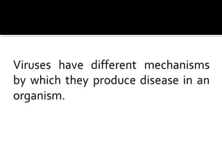 Viruses are small infectious agents that can only replicate inside living cells. They produce disease through different mechanisms, such as remaining dormant within the body like herpes simplex virus or causing illnesses like Epstein-Barr virus which causes glandular fever and varicella zoster virus which causes chickenpox and shingles.