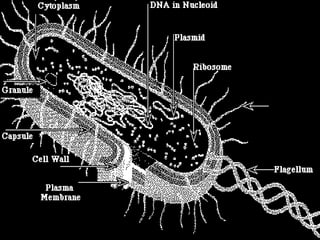 This document summarizes key aspects of viruses, bacteria, and their interactions. It defines viruses as non-cellular particles composed of genetic material and protein that can infect living cells. It then describes the structures of some specific viruses and bacteria, including their nucleic acids, protein coats, and cellular structures. It also outlines several bacterial processes like respiration, reproduction, and symbiotic relationships between bacteria and how they obtain energy.