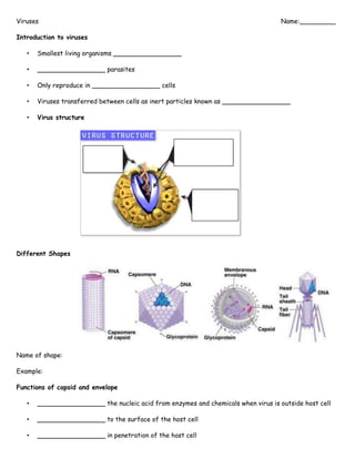 Viruses are the smallest living organisms and can only reproduce inside host cells. They transfer between cells as inert virus particles and have different shapes like spheres or cubes. Viruses have a protein capsid that protects their nucleic acid and may have an envelope that attaches to host cells to aid in penetration. Retroviruses contain RNA and use reverse transcriptase to change their RNA into DNA which can then be inserted into the host genome.