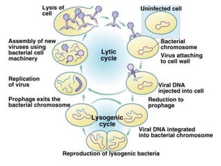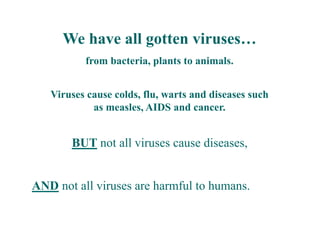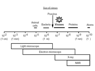 Viruses are parasites that can only replicate inside living host cells. They are made up of genetic material surrounded by a protein coat and have no cell structure of their own. Viruses come in many shapes and sizes but are typically 20-400 nanometers. They infect bacteria, plants, and animals. A virus replicates by entering a host cell, releasing its genetic material, and hijacking the cell's machinery to produce new virus particles that eventually cause the cell to burst and release new viruses. Viruses can have DNA or RNA as their genetic material and replicate through either a lytic or lysogenic cycle.