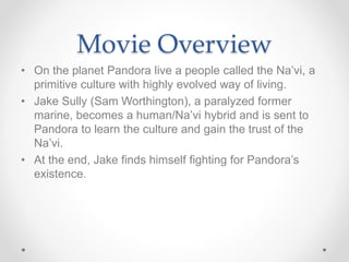 This document provides an overview and analysis of the 2009 film Avatar. It summarizes the plot, in which in the future, a human becomes part of an alien culture on Pandora called the Na'vi by connecting with an "avatar" body. Scenes from the film are then described and analyzed, including Jake's first experience in an avatar body, a chase scene with a dangerous creature, a meeting between Jake and the Na'vi spiritual leader Mo'at, and a connecting moment between Jake and Na'vi Neytiri. Details like camera angles, shots, lighting, color, and music are discussed.