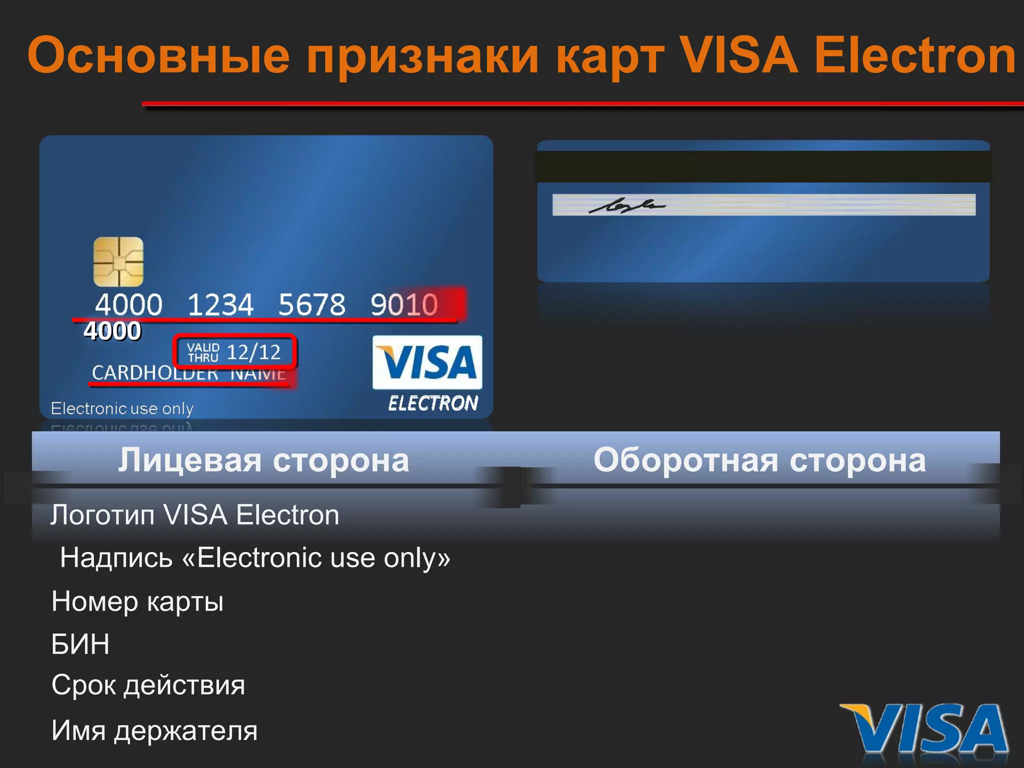 Документ описывает основные признаки карт Visa Electron, включая визуальные элементы, такие как логотип, номер карты и надписи. Указано, что карты имеют магнитную полосу и обязательную подпись держателя, которая может иметь защитные особенности. Также сообщается о возможном отсутствии полного номера карты и различных правилах оформления относительно сроков действия и имени держателя.