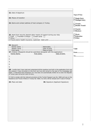 This document is a work visa application form for the Republic of Turkey Ministry of Foreign Affairs. It requests information such as the applicant's personal details like name, date of birth, passport information, contact information, duration and purpose of stay, employment and financial support. The applicant certifies that the information provided is true and correct, and understands that possession of a visa does not guarantee entry into Turkey.