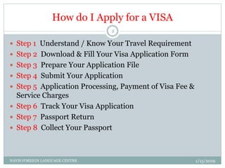 The document outlines the steps for Indians applying for a Japan visa, detailing the visa application process including understanding travel requirements, submitting forms, and tracking applications. It provides contact information for visa processing agencies and outlines visa fees and processing times. Additionally, it includes a checklist of required documents and important information related to the application process.