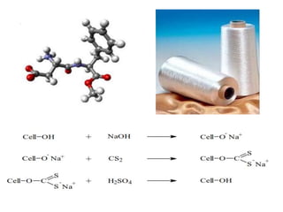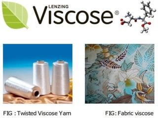 This document provides information about viscose rayon fiber, including its raw materials, manufacturing process, properties, and other types of regenerated cellulose fibers. It discusses that viscose rayon is made from cellulosic materials like wood pulp or cotton linters through a process involving chemical treatments and spinning. The manufacturing process involves steps like preparation of wood pulp, steeping, shredding, aging, churning, mixing, ripening, and spinning. It also outlines the properties of viscose rayon and compares it to other regenerated cellulose fibers like cuprammonium rayon, polynosic, and tencel.