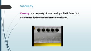 Viscosity is a measure of how quickly a fluid flows, determined by internal friction between particles. Fluids with greater friction between particles, like molasses or ketchup, have higher viscosity and flow more slowly than those with less friction, like water or juice. The ramp test can compare viscosities by timing how long it takes fluids to flow down a ramp, and viscosity can be investigated by testing fluids at different temperatures - viscosity decreases as temperature increases because particles slide and roll more easily with added energy.